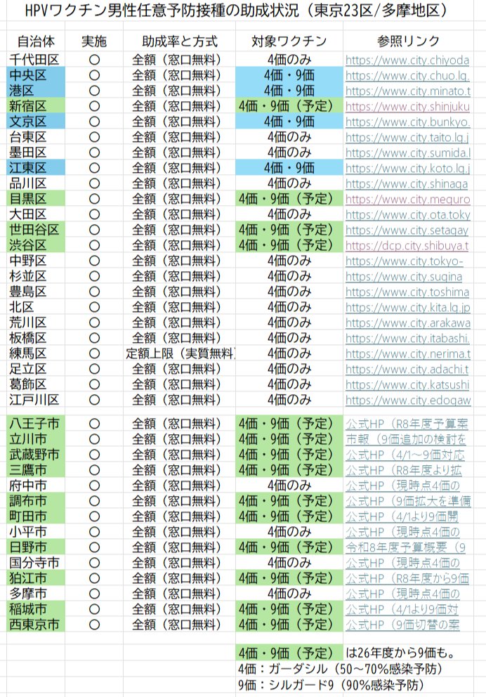 2025~26年度におけるHPVワクチン男性任意予防接種の助成状況(東京23区と多摩地区)の表をつくったよ。意外と大変だったがいろいろわかった。