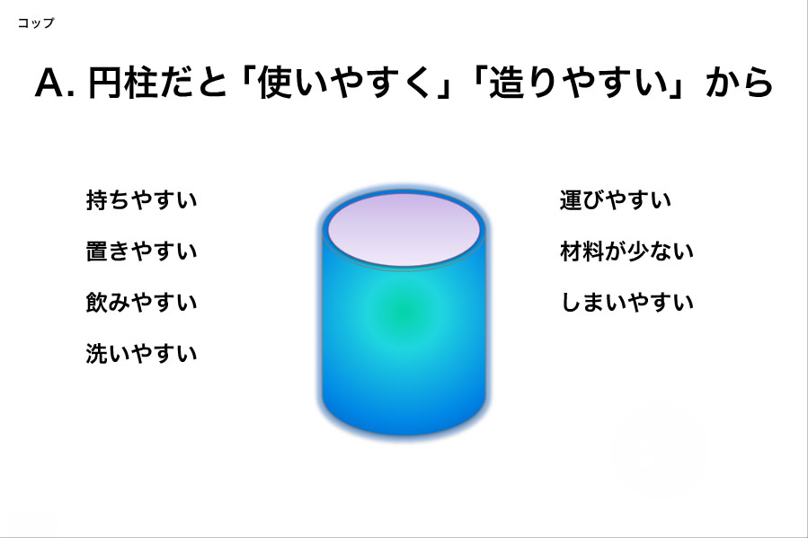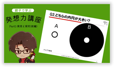 これは、2021年に埼玉県上尾市で行ったオンラインSTEM講座をもとにしたYouTube動画(11分から23分まで)です。Part1-1:発見と探究(前編)、Part1-2:同(後編)では、さまざまな錯視図やなぞなぞ、無印良品の商品開発手法などから「発見と探究」の本質を解き明かします。Part2:カタチのフシギ(円柱)と、Part3:同(紙コップ)では、身近なものを題材に、発想力を鍛えるパートです。最後のPart4:邪魔せず伸ばす、では子育てにおける発想力の鍛え方を、私自身の子育て経験を交えてお話しします。